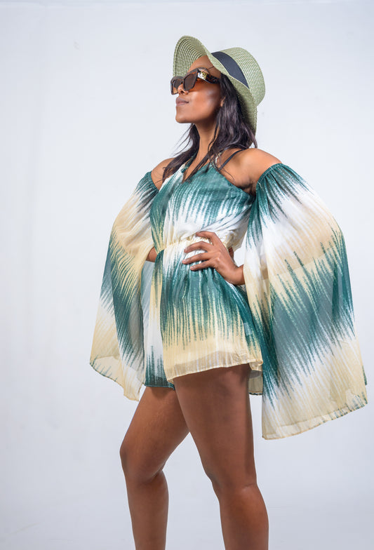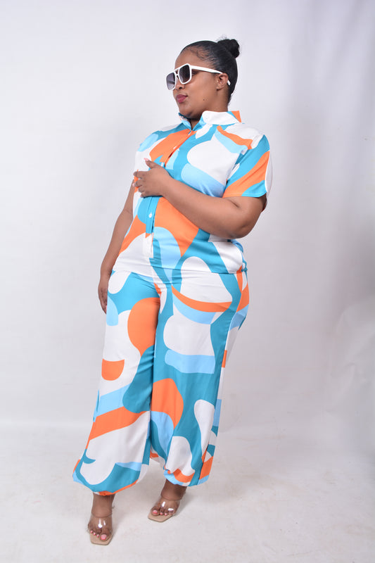 T8264 Ladies White, Green, Orange & Blue Wide Leg Tapered Ankles Jumpsuit
