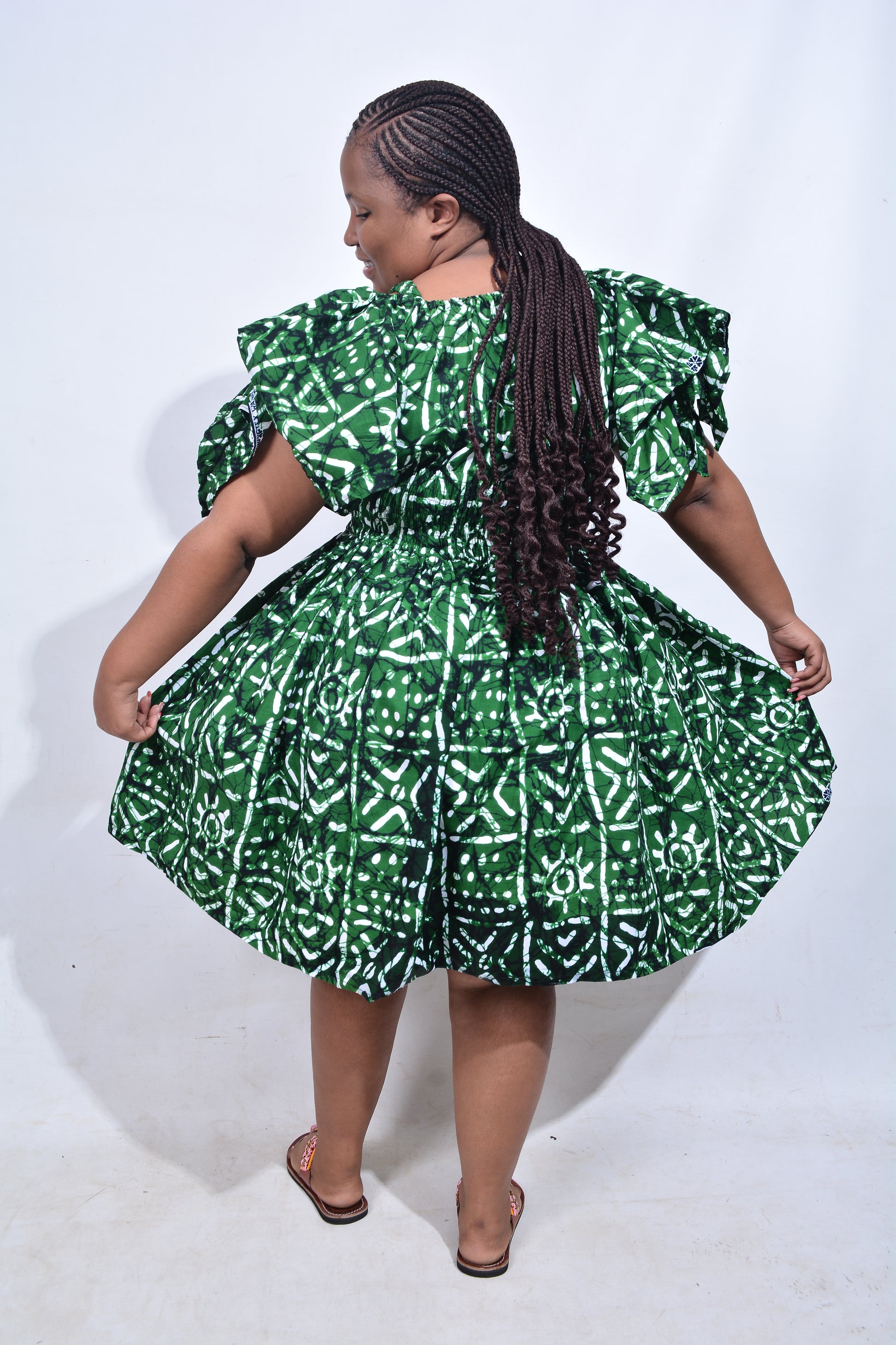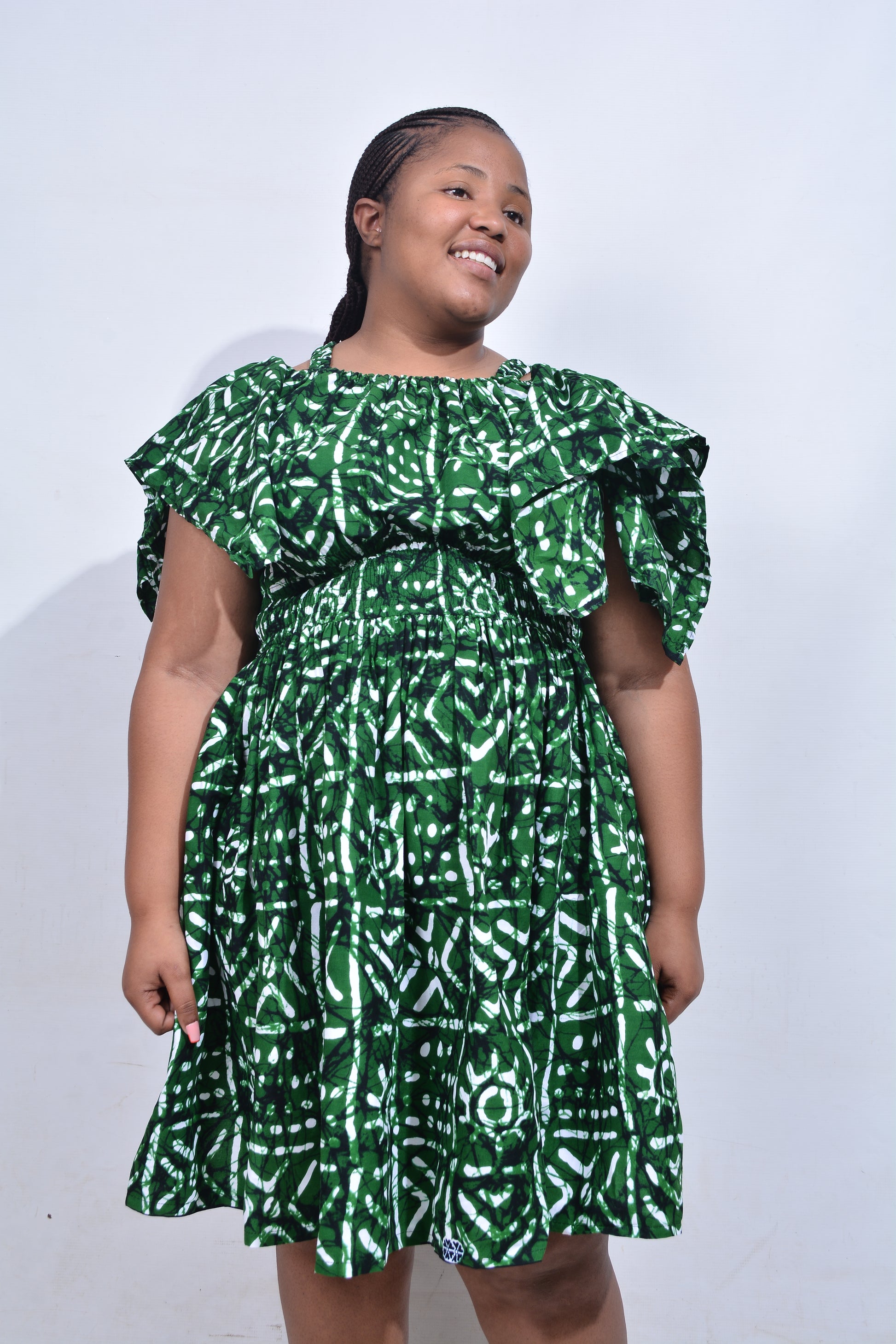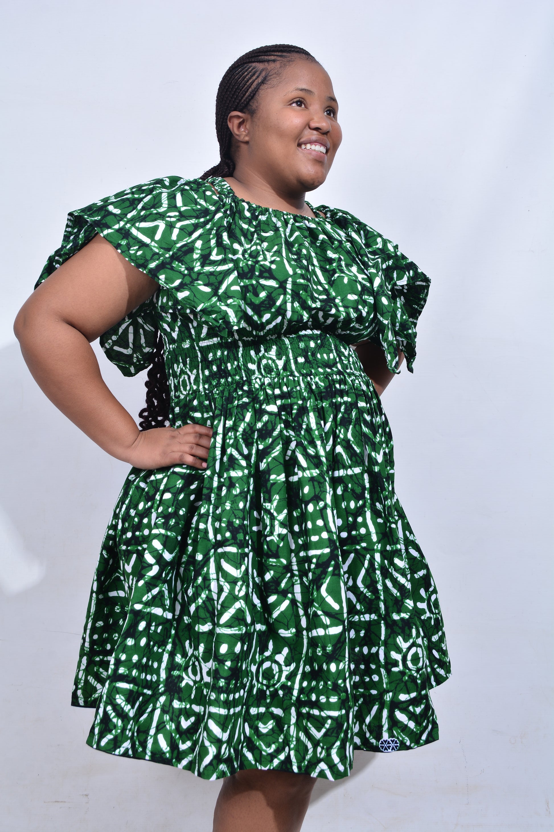 This dress has an elastic waist, to fit up to XXL. The length goes below the knee for the average height person. The dress has shoulder straps and short sleeves. Dominant colours are Green, White & Black. Ideal to wear when commemorating special occasions such as Africa Day, Weddings, Family Re-Unions.