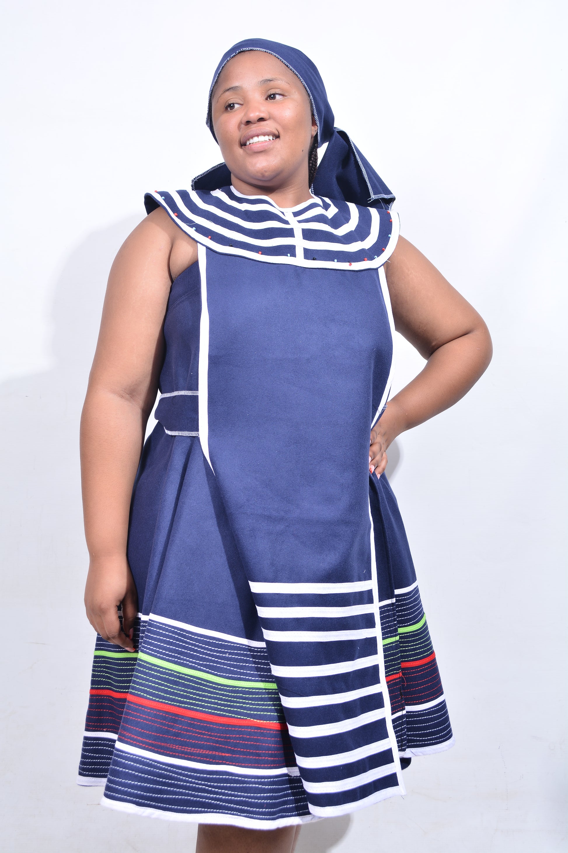 This outfit is a free size outfit, to fit up to 8XL. The length goes comfortably below the knee for the average height person for a dignified mature look. The outfit has no sleeves, ideal for hot weather. The outfit has a matching headgear and black beaded chest and shoulder cover. Dominant colours are Navy Blue, White, Lime & Red. Ideal to wear when commemorating special occasions such as Africa Day, Weddings, Family Re-Unions. Inspired by the Xhosa Tribe of the Eastern & Western Cape of South Africa.