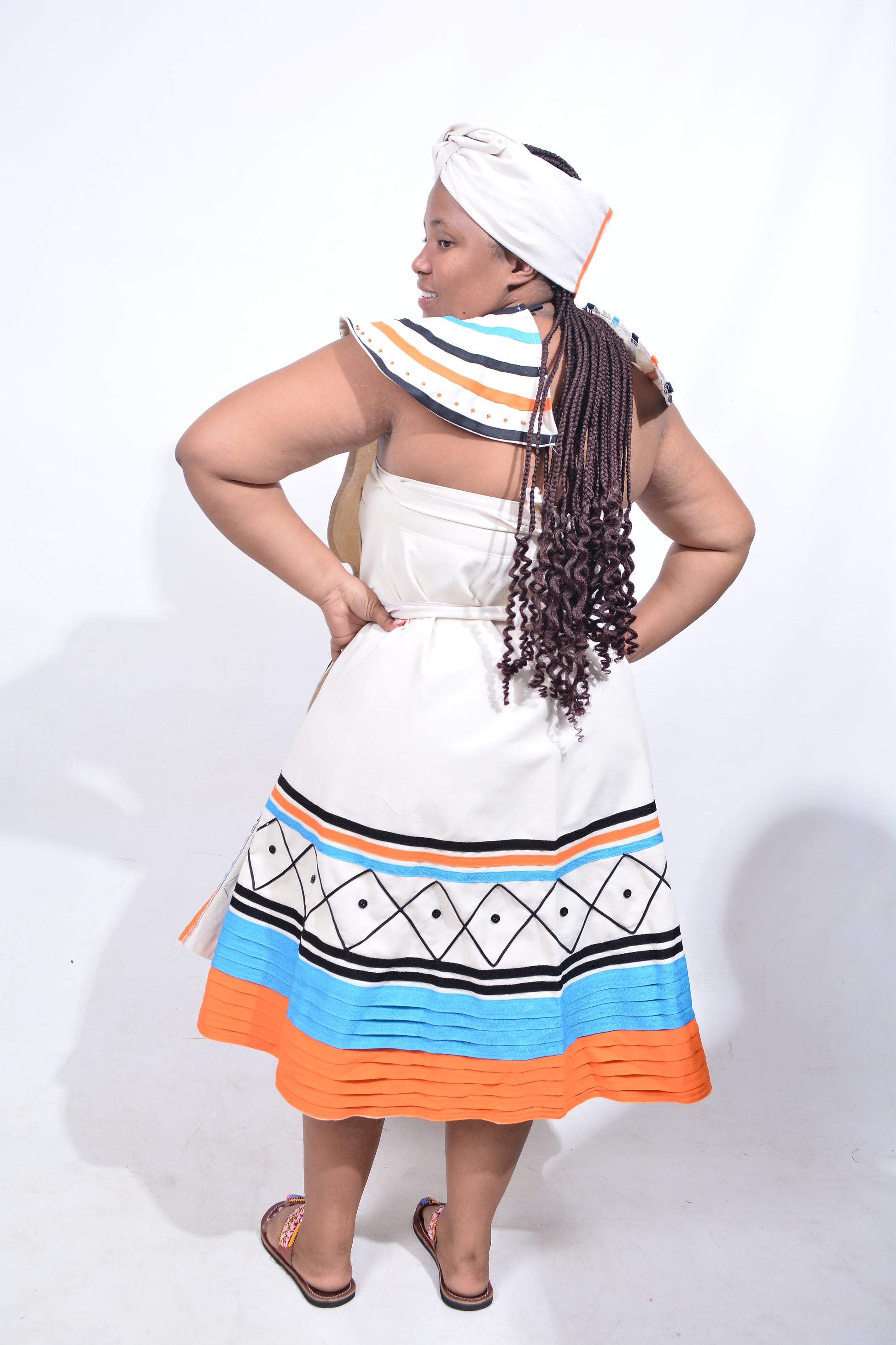 T8195 Traditional Xhosa 3 piece African Cream, Orange, Blue & Black Outfit