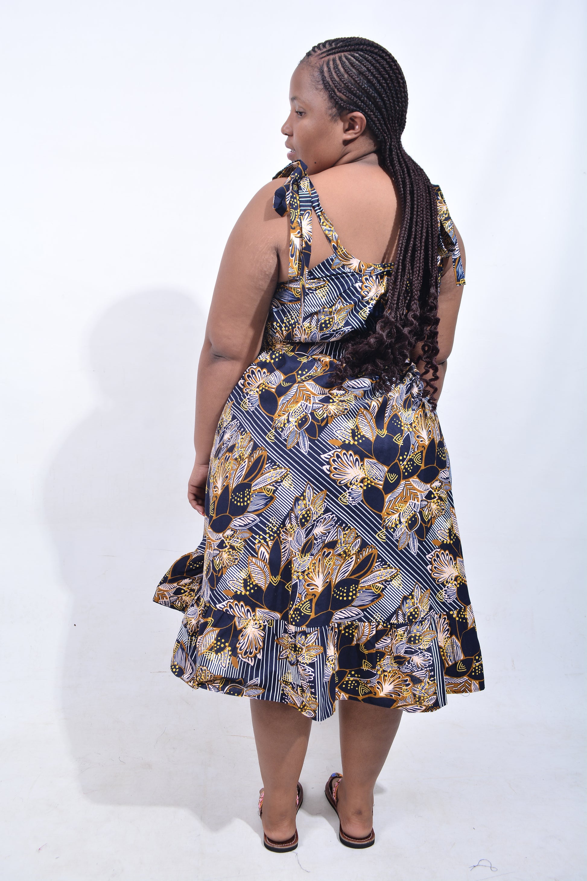 This dress is a free size dress, to fit up to XXXL. The length goes below the knee for the average height person. The dress has shoulder straps and no sleeves, ideal for hot weather. The dress has a thin matching belt. Dominant colours are Navy, White, Mustard & Black. Ideal to wear when commemorating special occasions such as Africa Day, Weddings, Family Re-Unions.