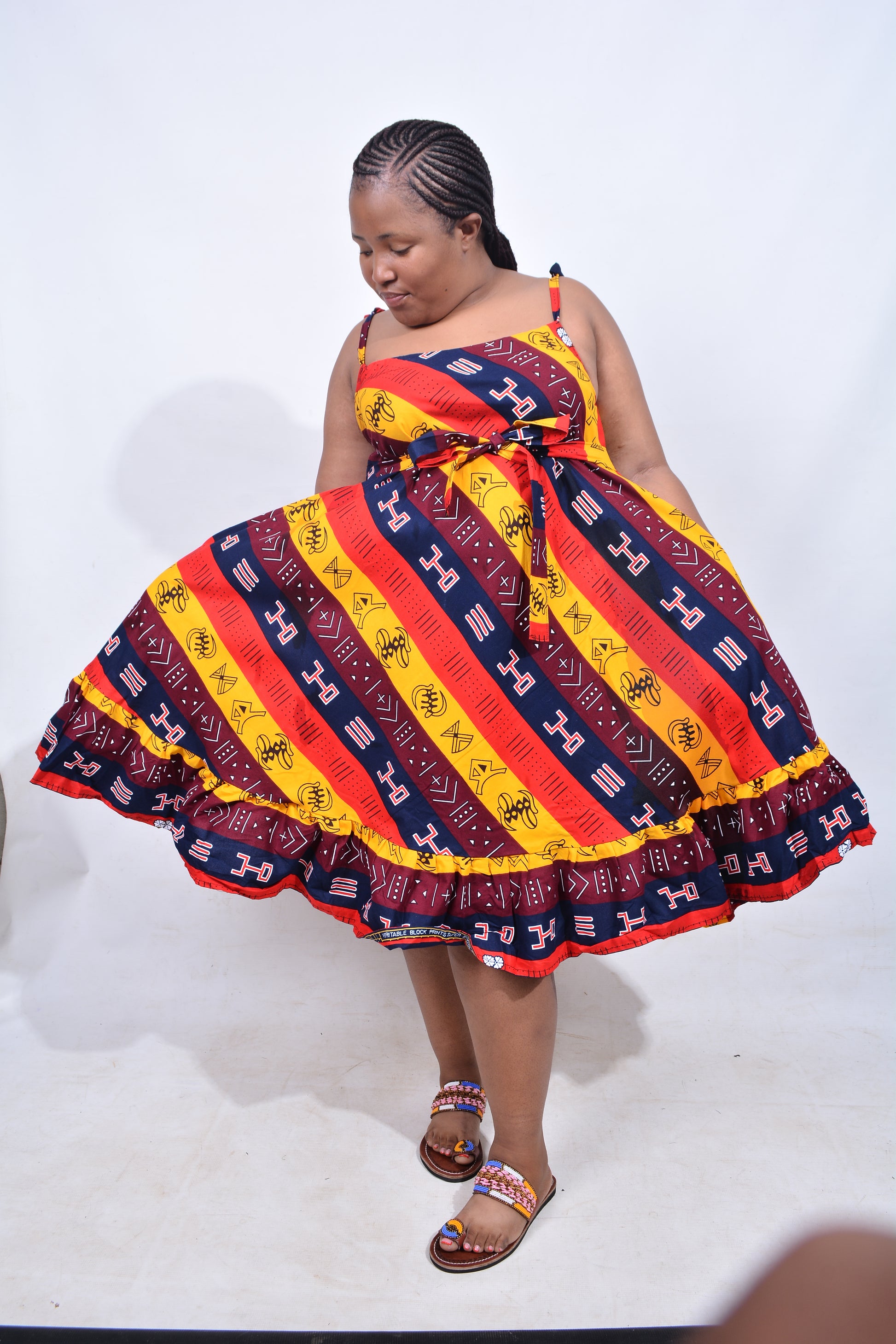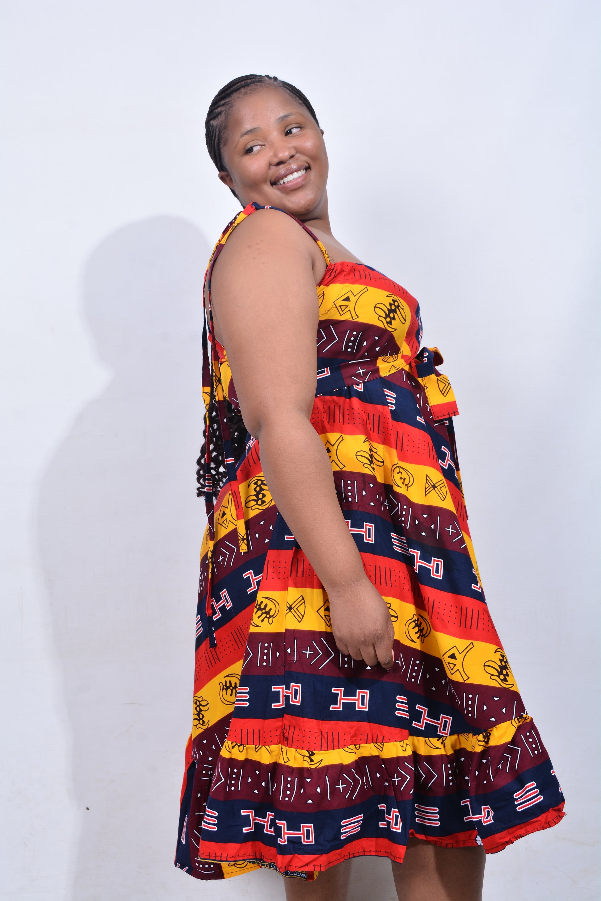 This dress has an elastic waist, to fit up to XXXXL. The length goes below the knee for the average height person. The dress has shoulder straps and no sleeves. Dominant colours are Yellow, Red, Navy, White & Brown. Ideal to wear when commemorating special occasions such as Africa Day, Weddings, Family Re-Unions.