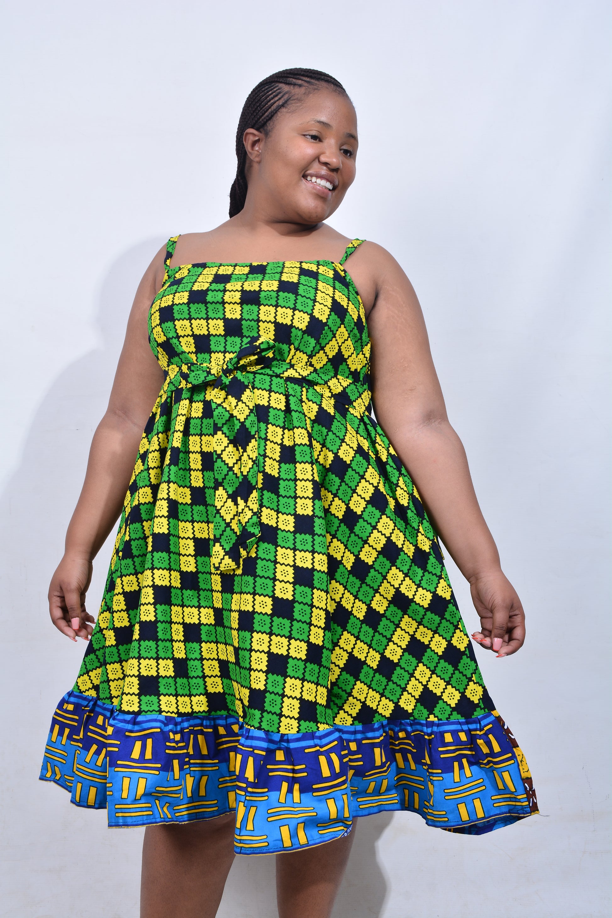 This dress has an elastic waist, to fit up to XXXXL. The length goes below the knee for the average height person. The dress has shoulder straps and no sleeves. Dominant colours are Blue, Green, Yellow & Black. Ideal to wear when commemorating special occasions such as Africa Day, Weddings, Family Re-Unions.