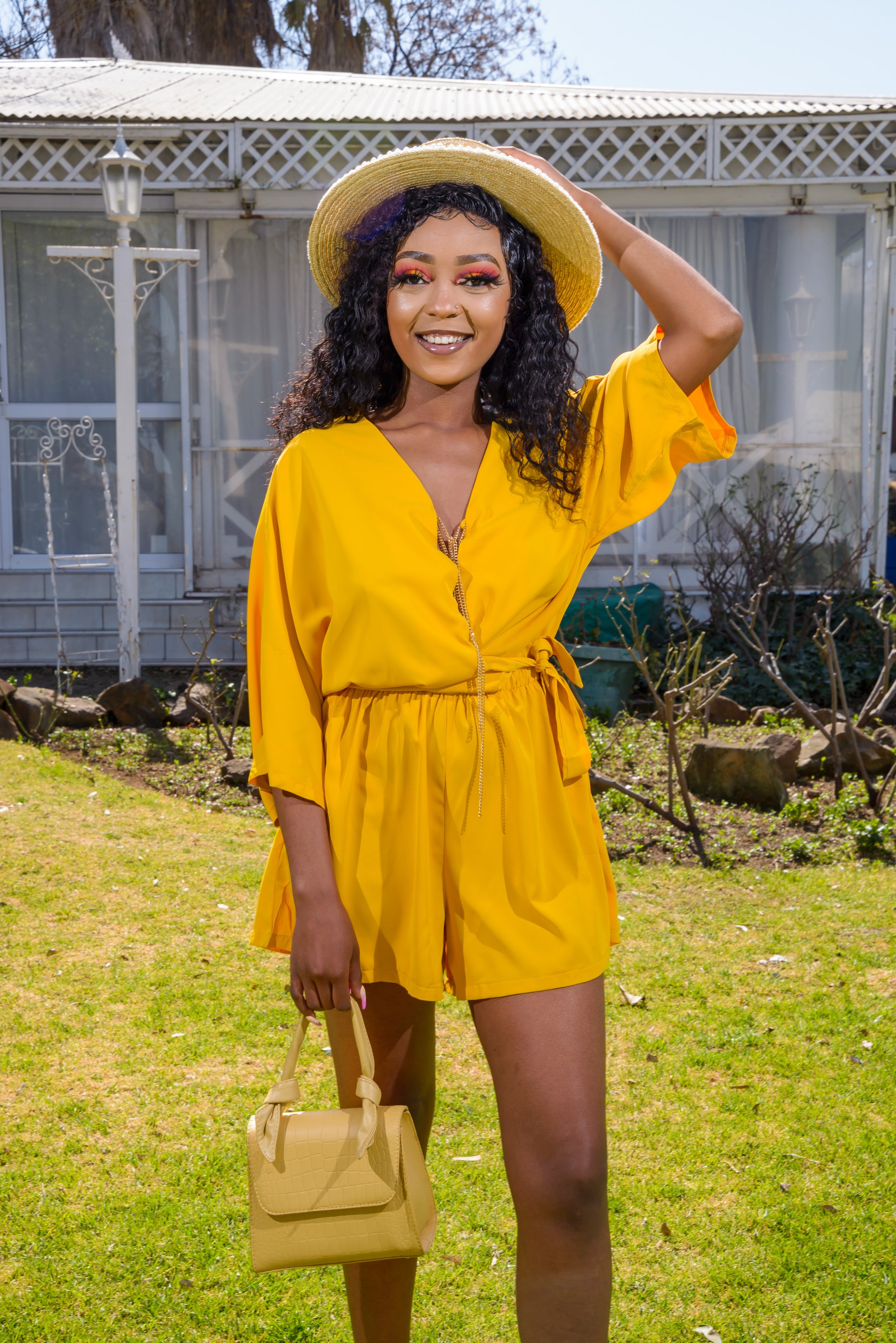 Ladies short jumpsuit with chain fasteners. Belted. Kimono sleeves, deep V neckline.
