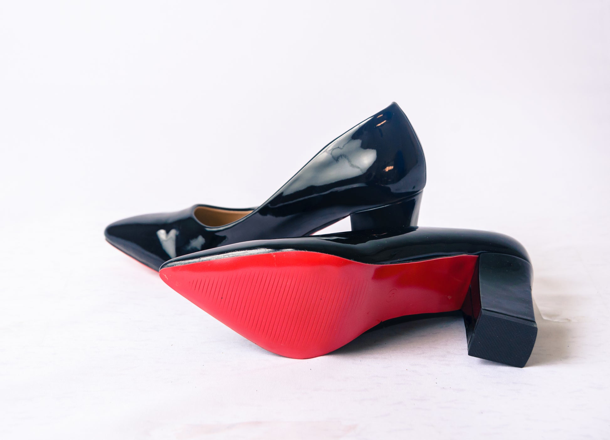 Women's patent block heels with red soles. Closed pointed toe.