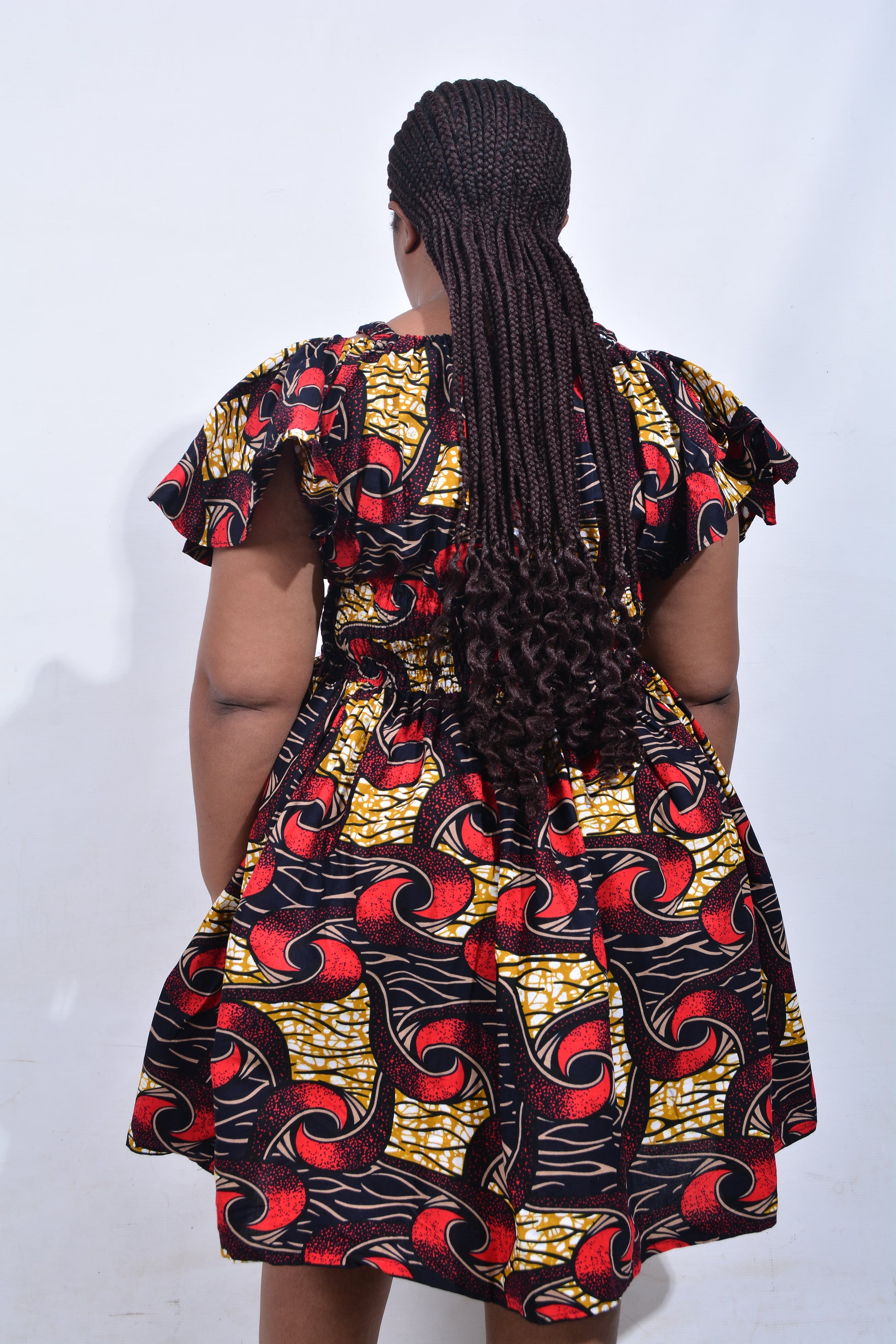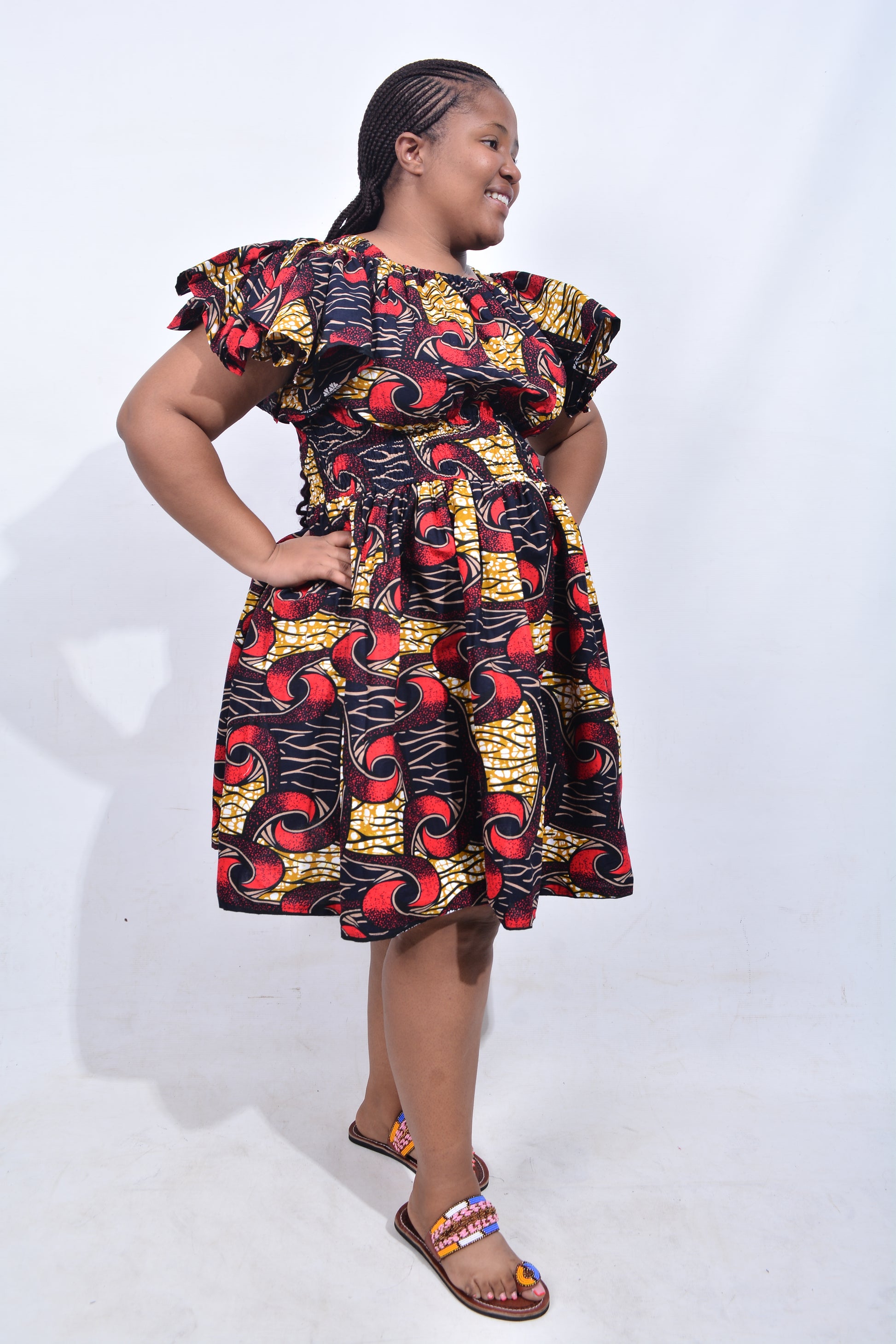 This dress is a free size dress, to fit up to XXXL. The length goes below the knee for the average height person. The dress has shoulder straps and short sleeves, ideal for hot weather. Dominant colours are Red, Yellow, Brown, White & Black. Ideal to wear when commemorating special occasions such as Africa Day, Weddings, Family Re-Unions.