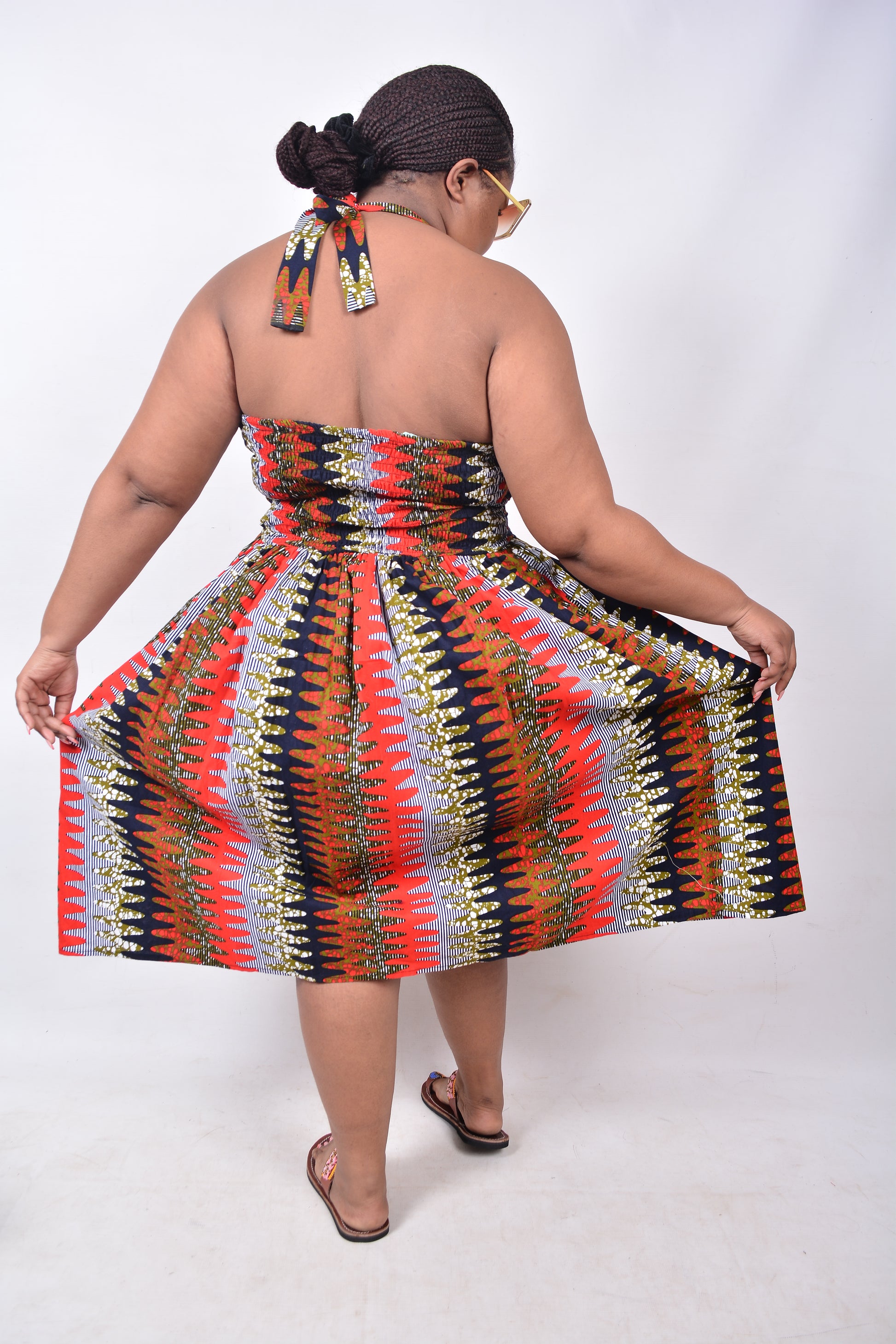 This traditional African Kente Fabric Red, Navy, White & Mustard Dress has an elastic waist, to fit up to XL. The length goes below the knee for the average height person. Ideal to wear when commemorating special occasions such as Heritage Day, Africa Day, Weddings, Family Re-Unions & Thanksgiving.