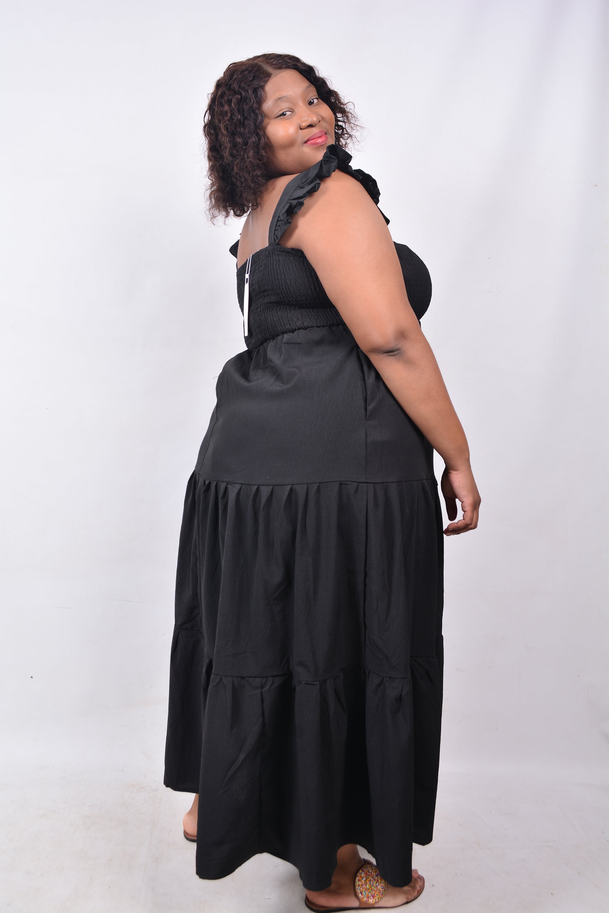 T8252 Ladies Maxi Length Black Dress with elastic waist and frilled shoulder straps