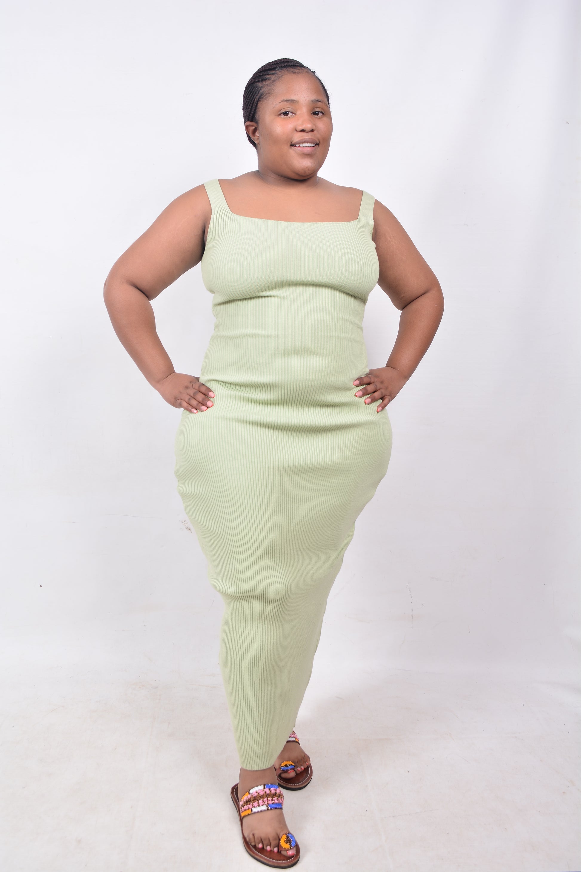 This dress is a woollen stretching dress, to fit up to L. The length goes below the knee for the average height person. The dress has shoulder straps and no sleeves, ideal for mild weather. Dominant colours are Green. Ideal to wear for casual social events.