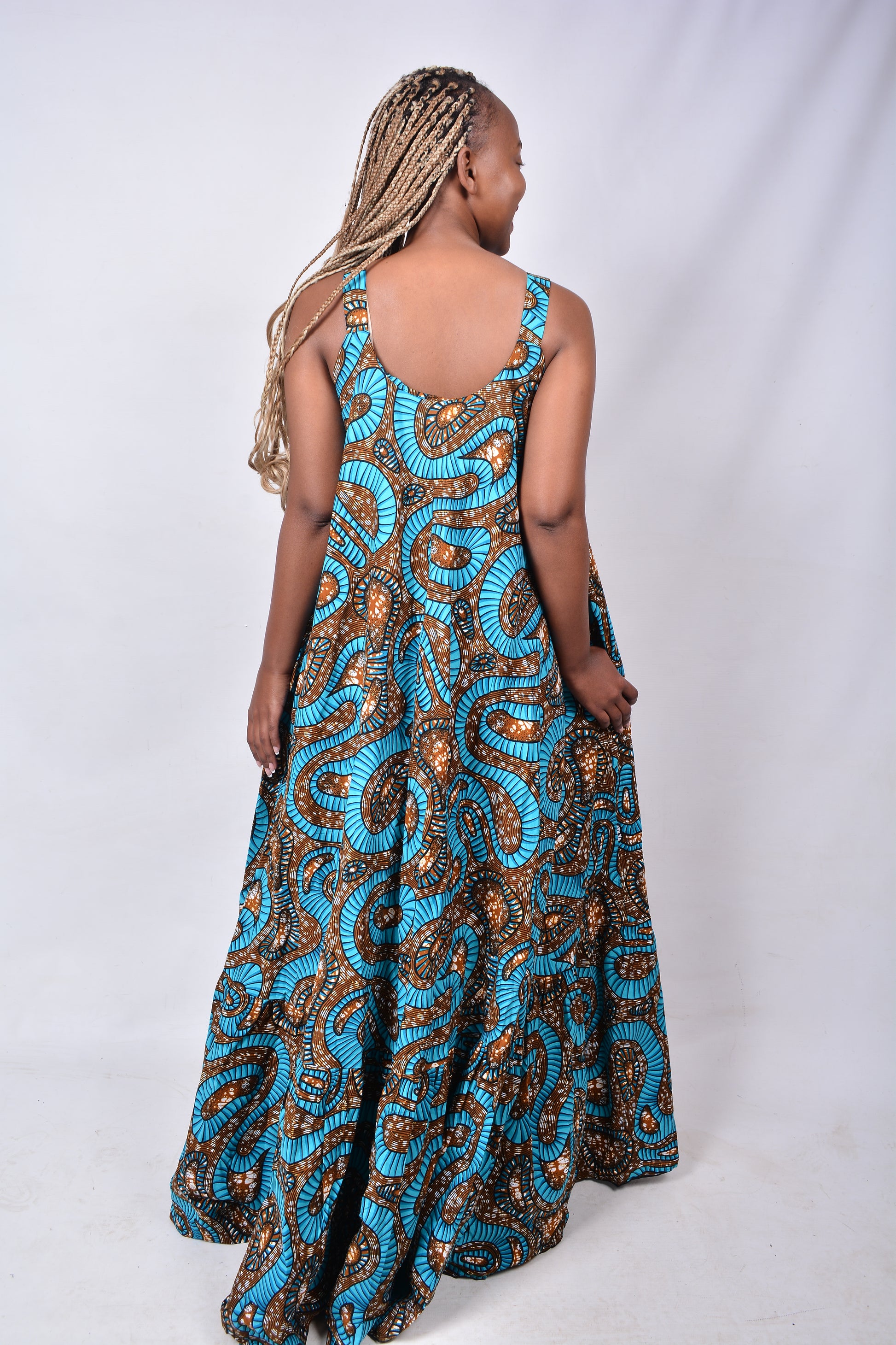 This traditional African Kente Fabric dress offers a lot of volume and style and has a free waist, to fit up to XL but a fairly small bust. The maxi length goes to the ankles for the average height person. The dress has shoulder straps, a thin matching belt and short sleeves. Dominant colours are Brown, Green & Black. Ideal to wear when commemorating special occasions such as Heritage Day, Africa Day, Weddings, Family Re-Unions & Thanksgiving
