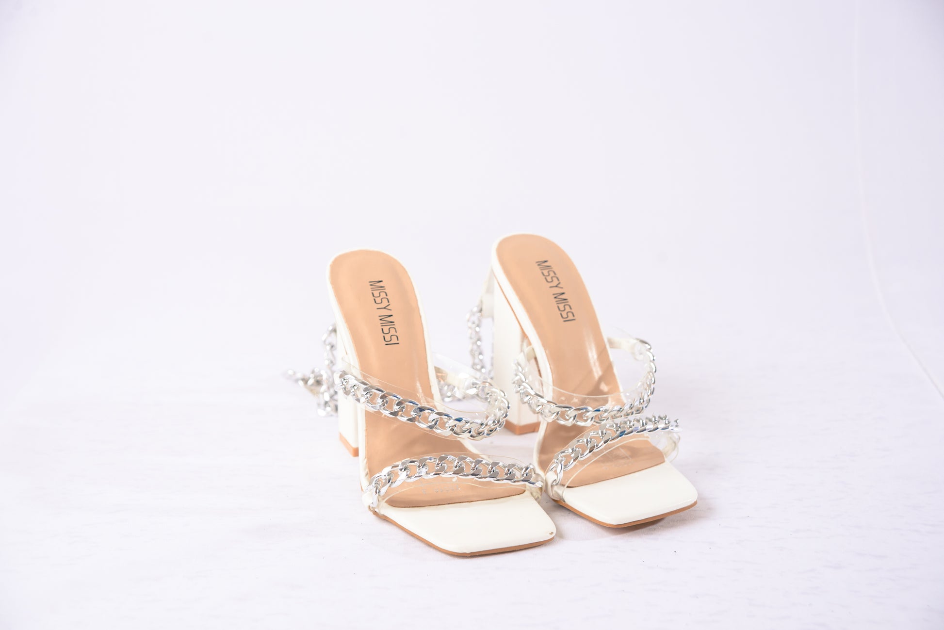 Square nose block heels. Silver chain on rubber straps.