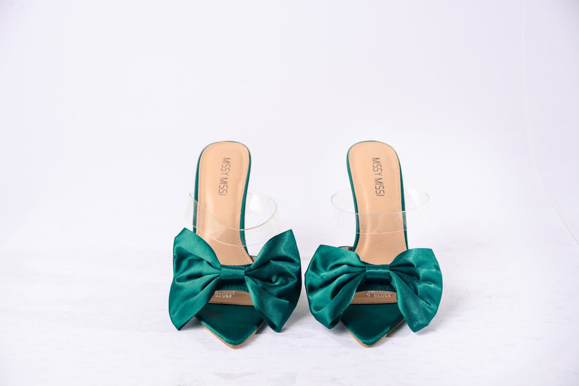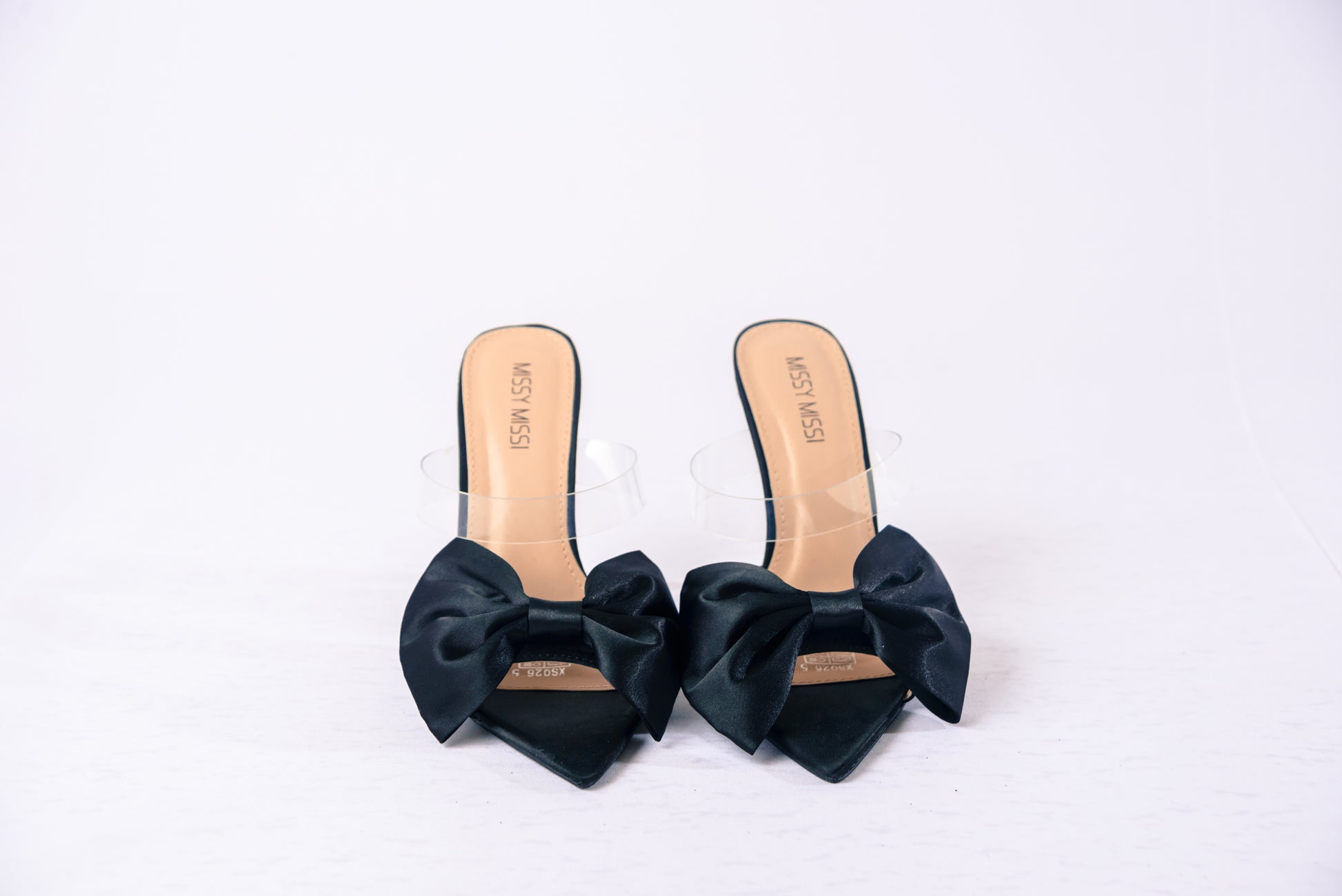 Bow slip-on stilettos with a clear rubber and satin band.
