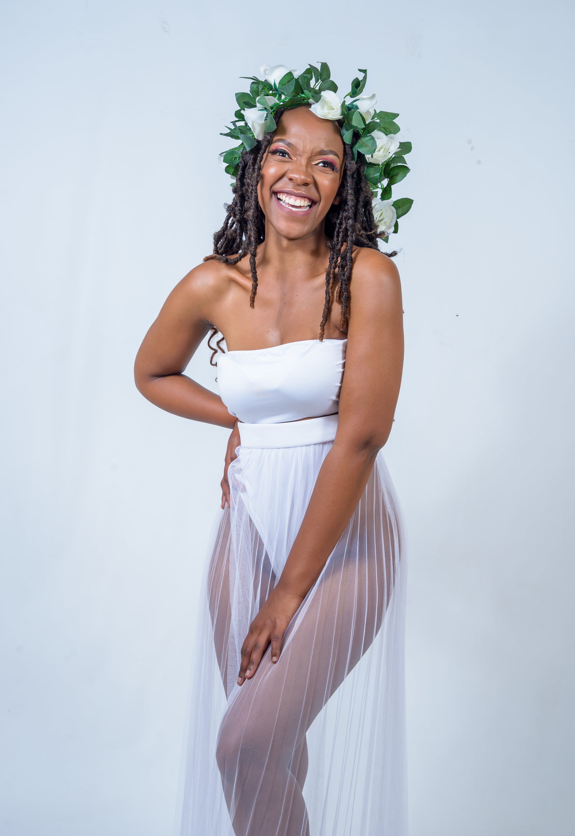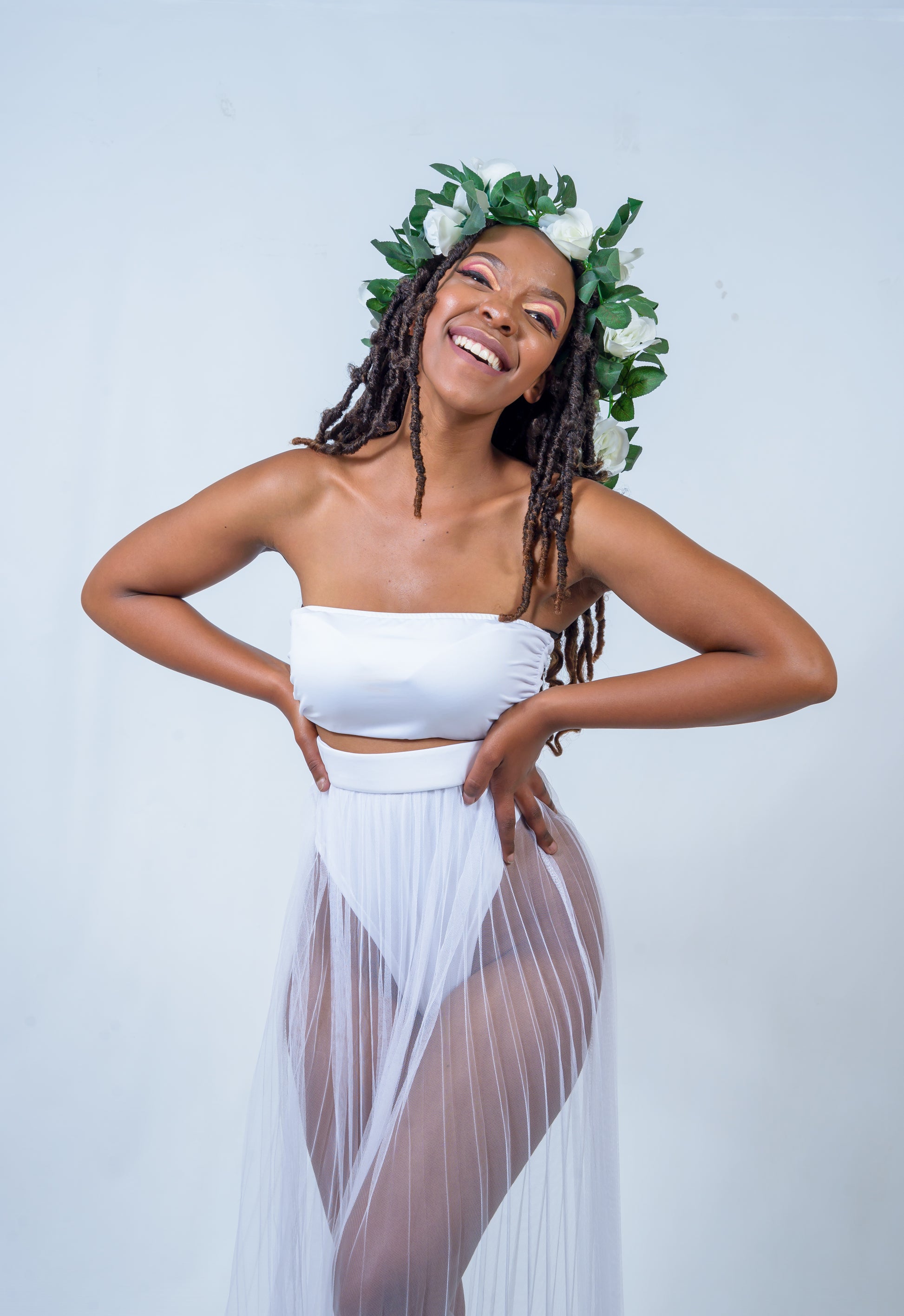 The women's two-piece include a bikini-skirt and top. The skirt is sunray pleated. Offered in colours white and black.
